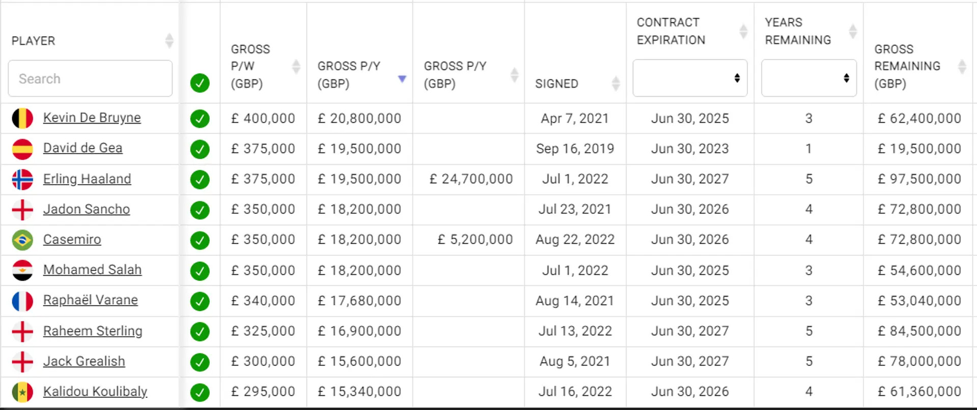 პირველ ადგილს კევინ დე ბრუინი იკავებს. "მანჩესტერ სიტის" ნახევარმცველი ერთადერთი მოთამაშეა, რომელსაც 400,000 გირვანქა სტერლინგი აქვს.